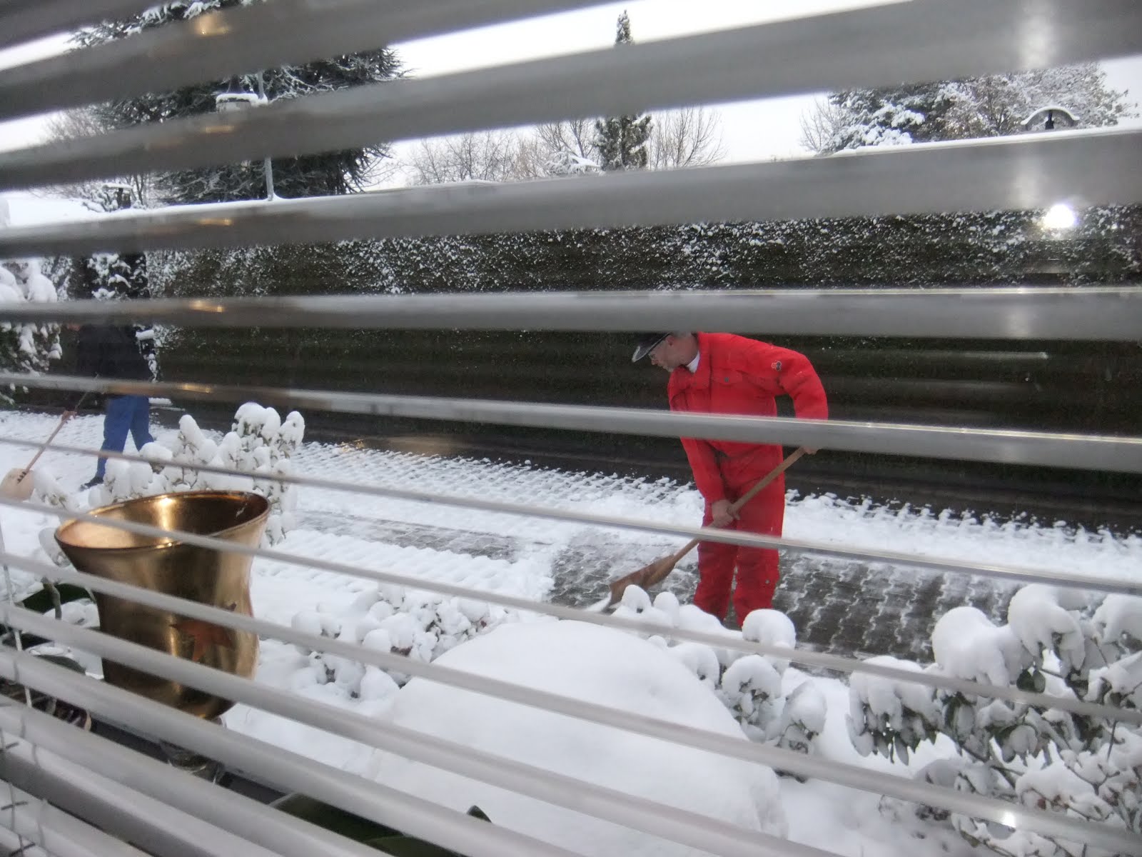 Primul Om-de-zapada si promt, primul "Winterdienst" (cu toate ca strada noastra a angajat personal pentru dezapezire doar pe perioada noiembrie - martie, cei doi Hausmeister au facut o exceptie! Le-am oferit ca bonus, un ceai firbinte)