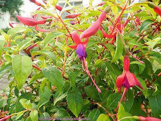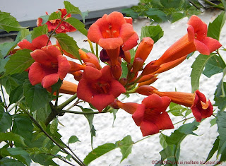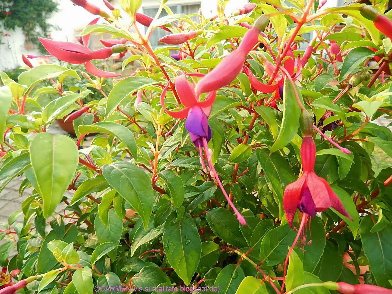 sigur ca pot, Tina draga, cu multa placere: dupa trandafiri, primele sunt petunii (cele lila pal si cele frez, cu multe vinisoare), urmatoarele flori sunt Campsis, sau Trompeta turcului ( e o planta agatatoare), urmatoarele se numes Echinacea, sau Palarie-de-soare (Sonnenhüte), iar ultima înainte de vrabiuta care bea apa, este o Fuchsie.