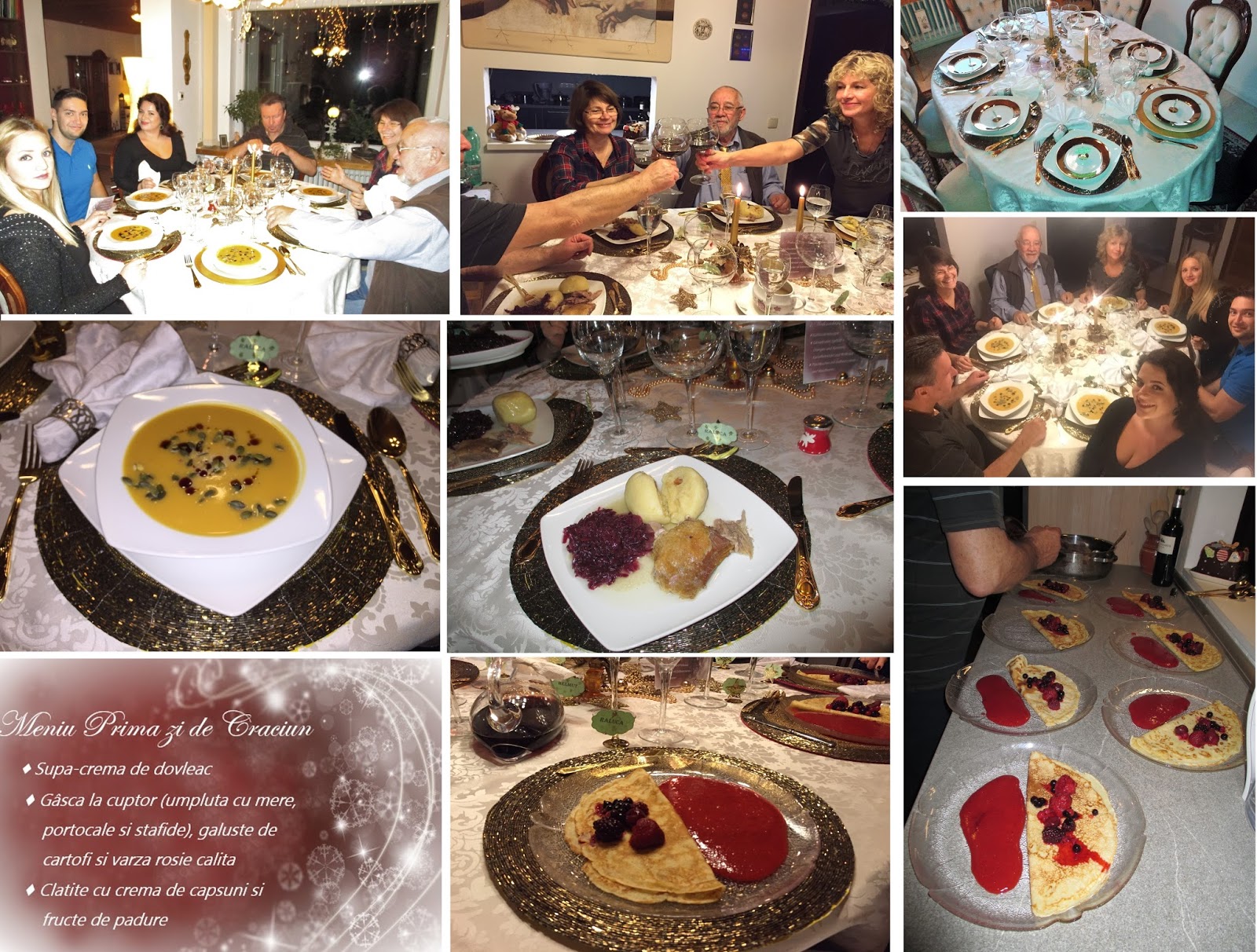 Pe la ora 19 ne-am asezat la masa si a început festinul: supa crema de dovleac, gâsca la cuptor (umpluta cu mere, stafide si portocale) galuste de cartofi si varza rosie calita, iar la desert, clatite cu piure de capsuni, garnisite cu fructe de padure (afine, mure, fragute si zmeura).
