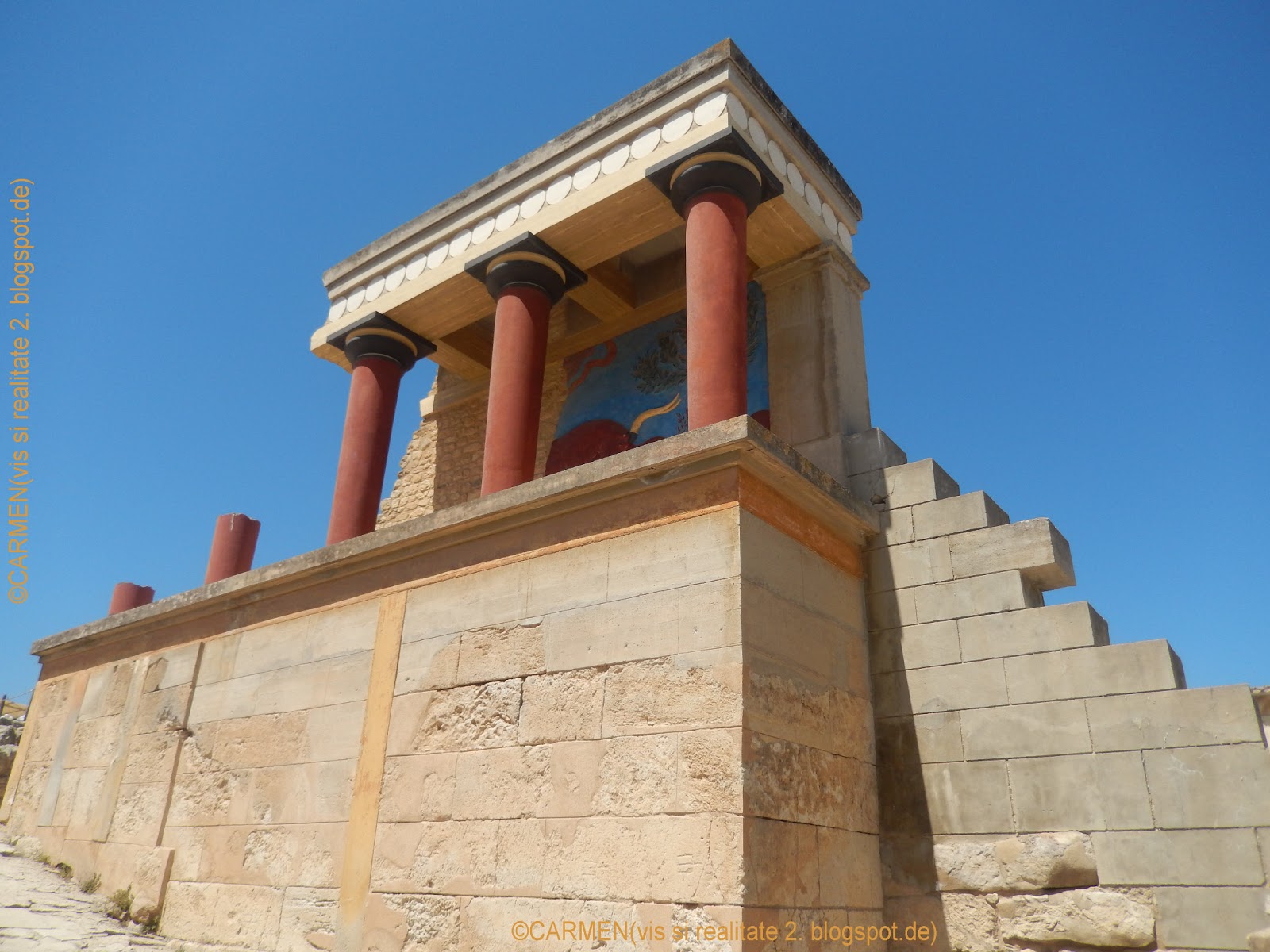 De cum am pasit printre ruinele acestui palat maret mi-am dat seama ca cei doi sirieni nu auzisera niciodata despre civilizatia minoica, de aceea am încercat sa le explic câte ceva, atragându-le atentia ca unor copii de scoala asupra frescelor, coloanelor, fara sa îi obosesc cu prea multe informatii. Pareau ca au înteles, pentru ca Iman se minuna mereu, rostind un "oooooo" prelung si traducea imediat sotului, care parea deasemenea deosebit de impresionat...