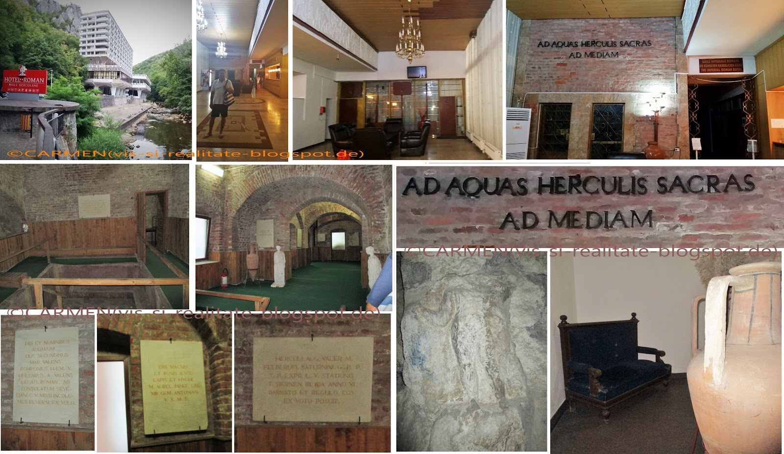 Baile Imperiale Romane au fost construite în anul 1838, pe locul vechilor bai romane care foloseau apa izvorului Hercules. S-au mai pastrat 4 încaperi cu doua bazine mari si doua cazi individuale. Odata cu construirea Hotelului Roman (1976), Baia Romana a fost înglobata la parterul hotelului." - citind placa ce descrie monumentul istoric, am fost foarte impresionati si am dorit sa vedem cu ochii nostri toate acestea. Asa ca am pasit în hol, la receptia hotelului...