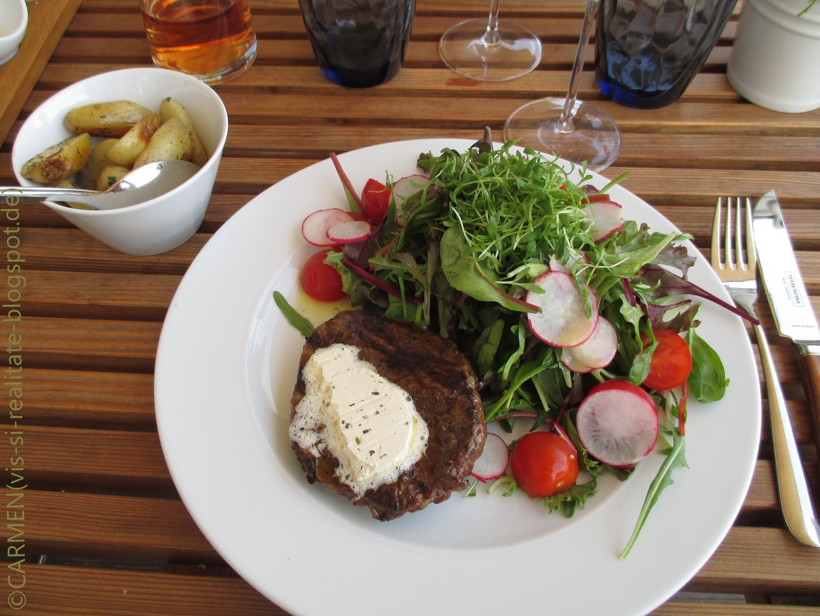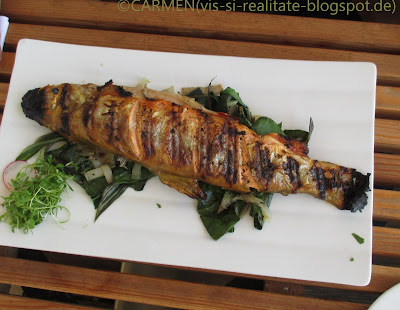 Plecati de la ora sapte si jumatate de acasa si dupa câteva ora de mers pe jos în superbul parc al Insulei Mainau, am si uitat de foame. Când am ajuns însa la castel, mirosul îmbietor de carne prajita la gratar ne-a amintit ca este cazul sa facem o pauza. Curtea castelului adaposteste câteva terase-restaurant, cofetarii si magazine de suveniruri, asa ca nu ne-a fost deloc greu sa alegem tot ce am poftit.