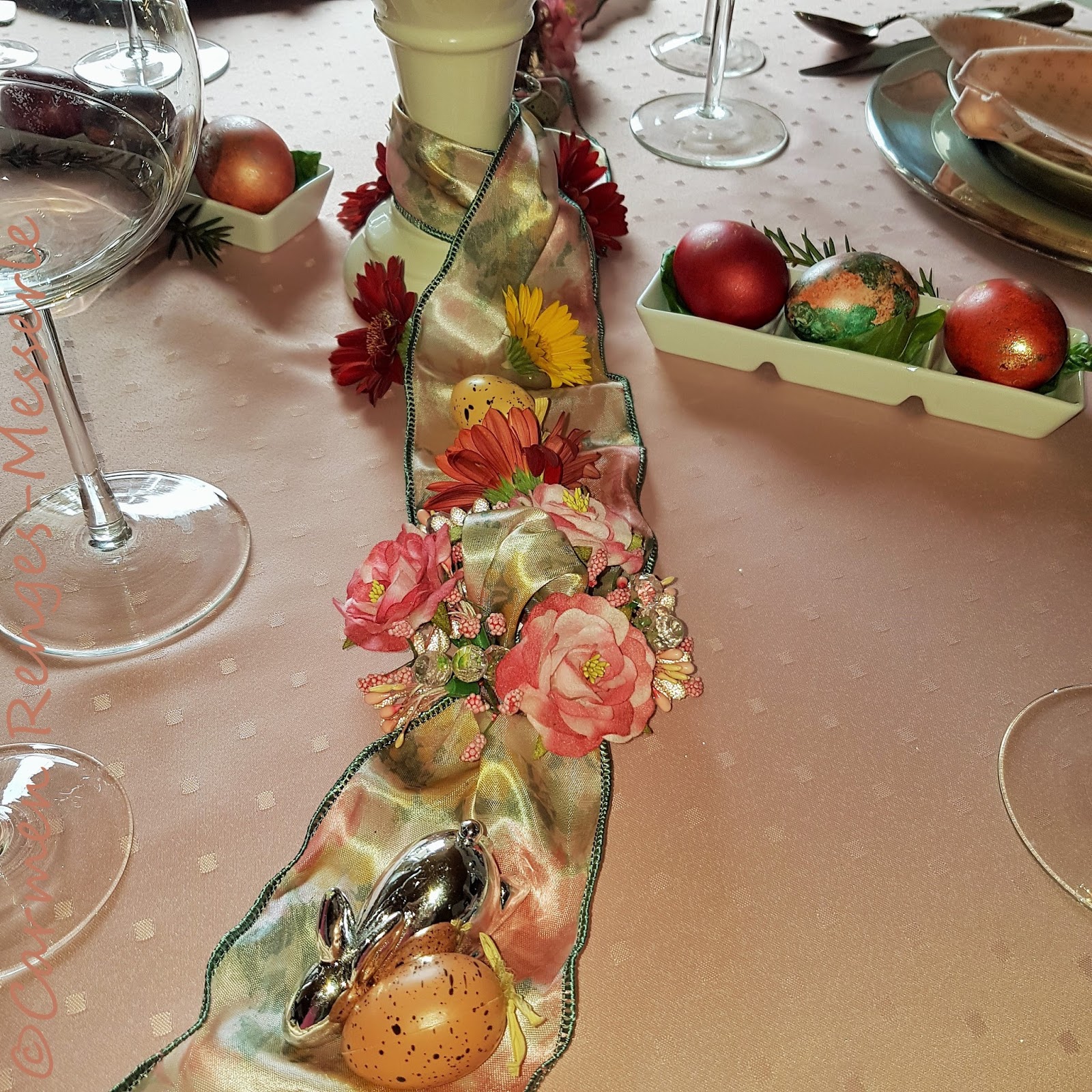 Am plasat în mijlocul mesei un sfeșnic din portelan alb cu lumânare roz-pal (am un sertar în care "colectionez" lumanari decorative în toate culorile si de toate formele☺) în jurul caruia am înfasurat o banta din matase, în culori pastel, festonata cu fir verde metalic. Firul metalic ofera tinuta bantei si eu am pliat-o usor, evantai, pe diagonala mesei. Pentru ca banta parea "golasa" am improvizat, folosinf doua inele decorative cu floricele roz, din acelea ce se pun pe supotrturile de lumânari pentru a împiedica ceara sa curga pe fata de masa. Am "umplut" inelul cu matasea bentiței. Decoratiunea înca tot mai parea saraca!