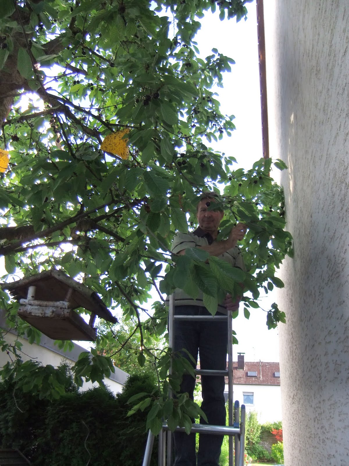 Am stiut ca începând de vineri, va fi permisa culegerea ciresilor, asa încât sâmbata dimineata, dupa ce ne-am baut cafeluta, ne-am echipat corespunzator si ne-am dus la livada. Eu am avut un cos si Helmut o galeata de 10 litri si ne-am gândit sa dam la cântarit doar galeata si ce voi aduna eu sa punem în galeata. Dar...dupa o ora am avut si galeata si cosul plin :)) Despre burti, nu mai spun! ☺