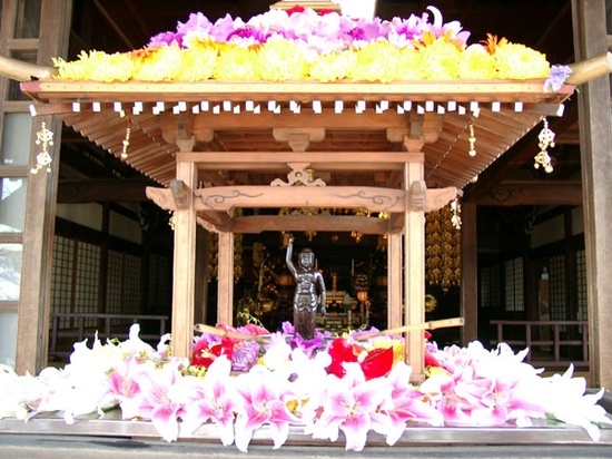 În temple se organizeaza Hanamido - "Sala Florala" unde se prezinta o statuie a nou-întrupatului Buddha, împodobita cu flori. Vizitatorii templului aduc petale de flori și stropesc capul statuii cu Amacha, un ceai din frunze fermentate de hortensii. Conform legendei, atunci când s-a născut Buddha, a plouat cu Amacha. Se spune că acest ceai are puteri magice, asigurând protectia fata de spiritele rele (Oni), de șerpi și insecte.