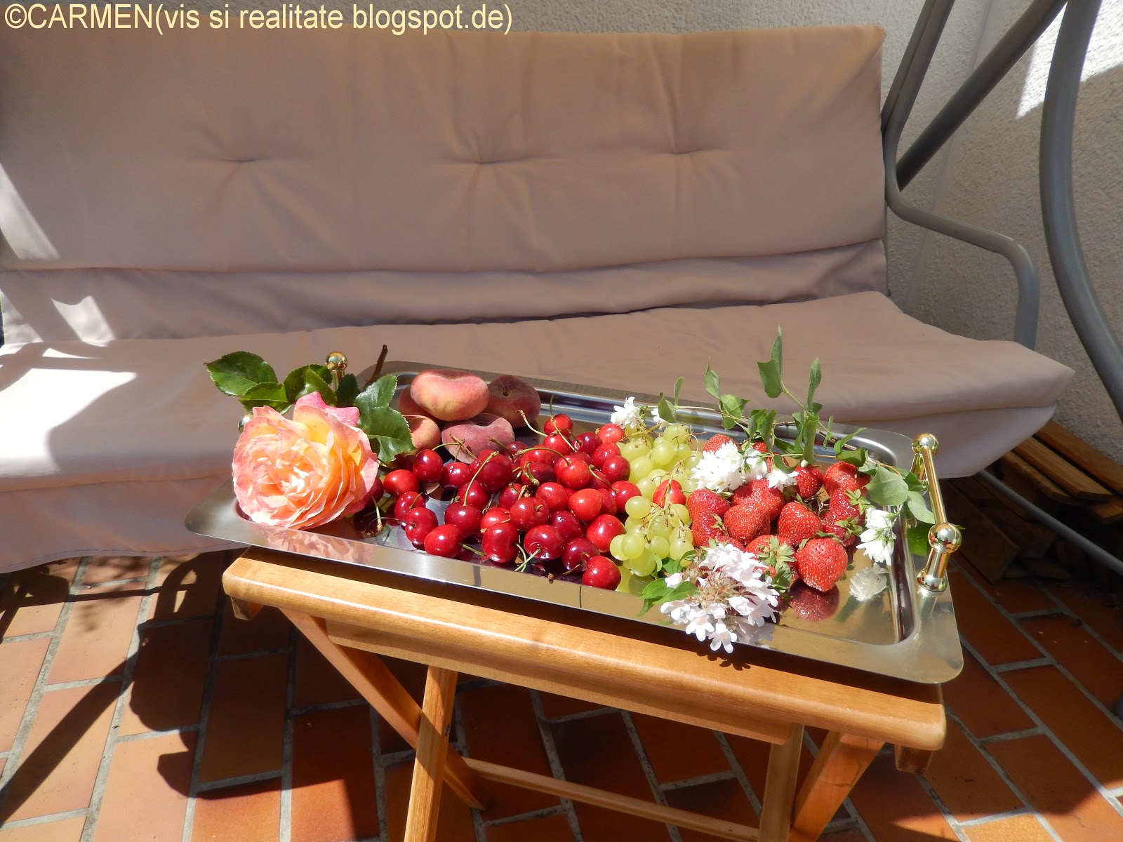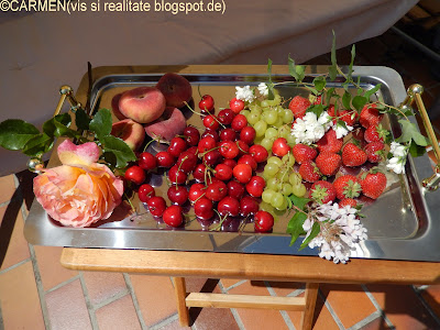 Am aranjat scoicile pe care le-am aduse de pe malul Mediteranei, am hranit pestisorii-aurii, am cules câteva flori si acum va invit lânga mine pe balansoar, la o portie de fructe de sezon :)