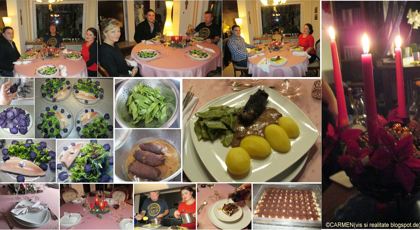 La aperitiv am avut salata de vinete si am ciocnit oua. Urmatorul fel de mâncare a fost rata la cuptor, cu galuste de cartofi si varza rosie calita (a fost dorinta fiicei mele, Raluca), iar la desert am avut pere Williams în vin rosu (dorinta lui "ginerica" ☺).