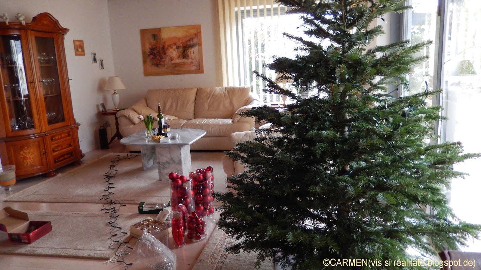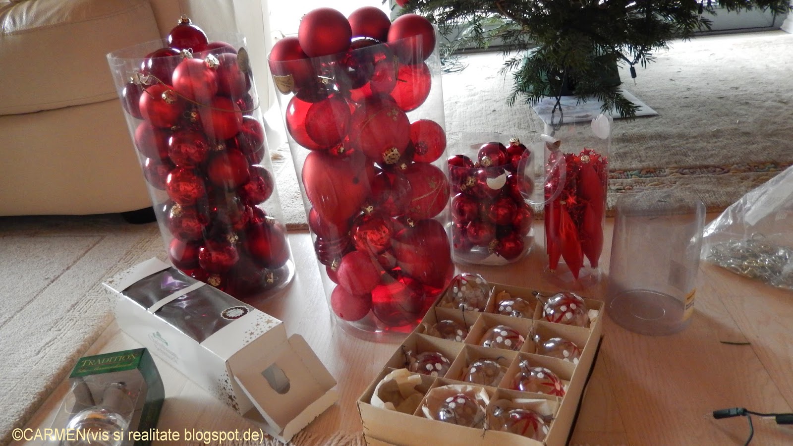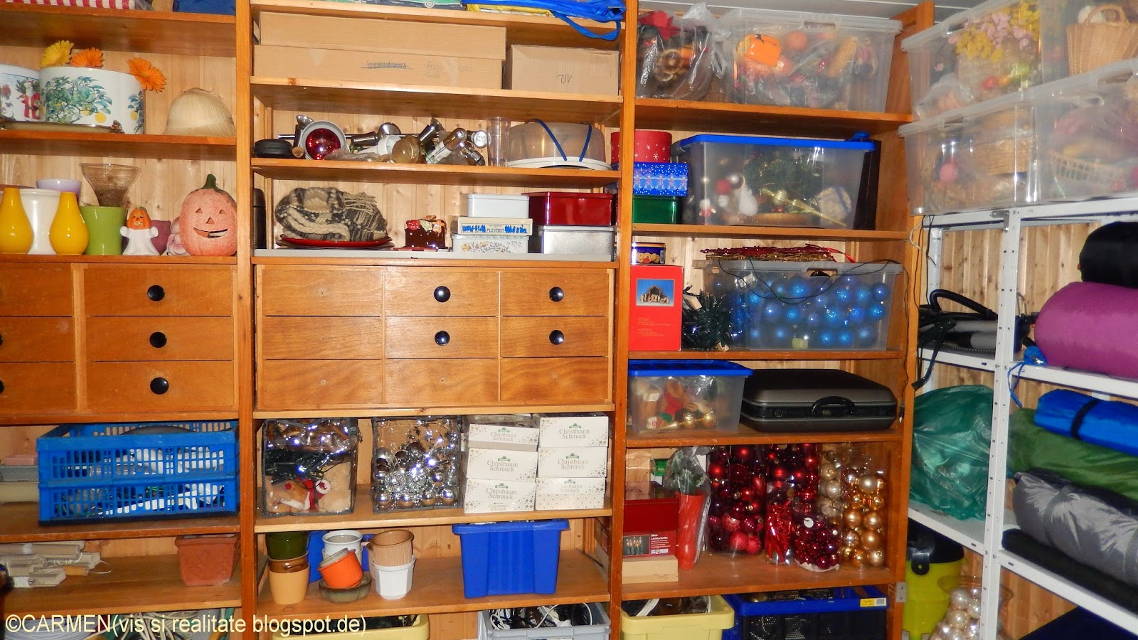Sâmbata am adunat din casa toate ornamentele de iarna. Am despodobit si bradul si l-am târat la marginea strazii, pentru ca luni dimineata este anuntata actiunea de strângere pe întreg cartierul. M-am despartit greu de el, tare frumos îsi tinea înca crengile! Dar... peste o luna este Ziua Inimilor si imediat dupa aceea vine Martisorul. Asa ca am umplut rafturile din pivnita cu globurile si decoratiunile sezonului hibernal si le-am lasat sa tina de urât ornamentelor de toamna.