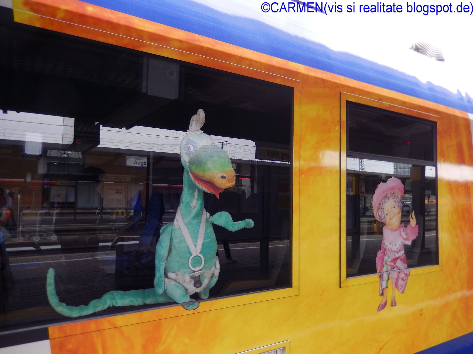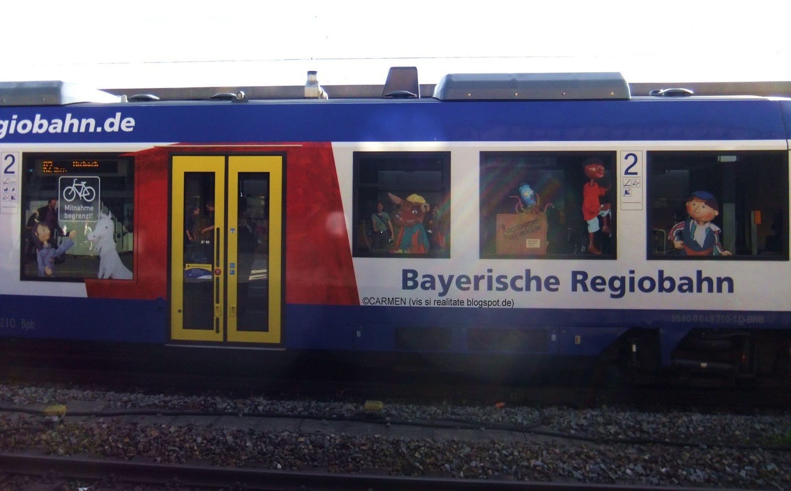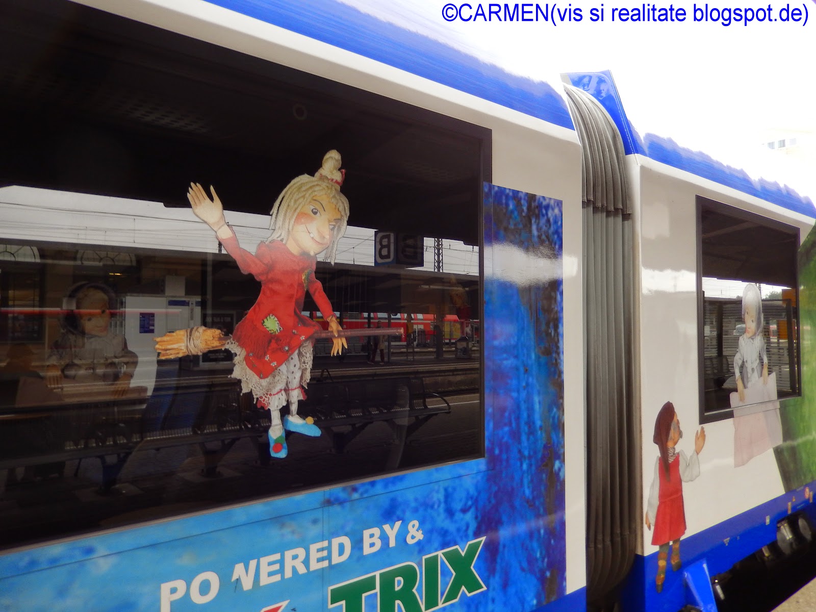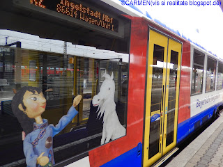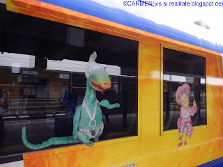 Ieri, conducând-o pe matusa mea la gara, am facut o noua descoperire: pentru ca anul acesta teatrul "Lada cu papusi" serbeaza 65 de ani de la debut, pe una din rutele regionale a fost pus în circulatie un tren format din doua vagoane, pictate cu personajele-stele ale teatrului de papusi: Jim Nasture (Jim Knopf), Lukas si Locomotova, Urmel, Kasperl, familia Mumin, Bill Bo, Leul si motanul Mikesch.