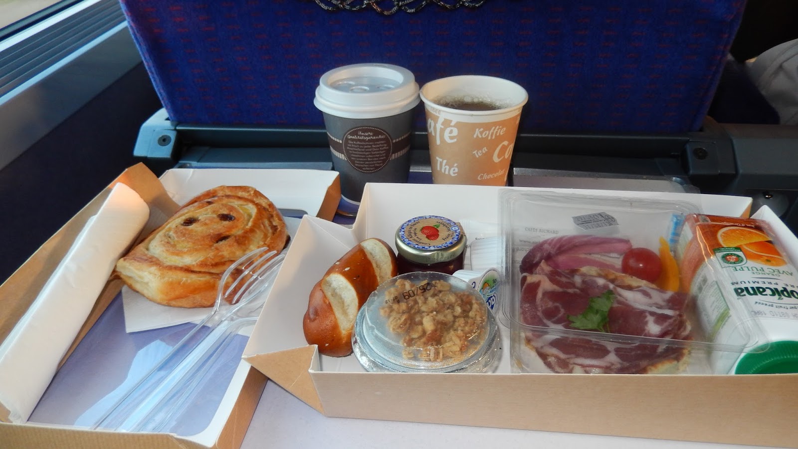 Pe când înca mai admiram ferestrele mari si curate si mângâiam plusul pufos al fotoliilor, au aparut pe culoar doi însotitori de bord împingând un carucior, exact ca la avion. Ni s-a urat bun venit si ni s-au înmânat câte un pachet cu mâncare si cate un pahar cu ceai si unul cu cafea. Apoi cei doi s-au îndepartat, nu înainte de a zâmbi si de a ne ura Bon voyage! A fost practic un pleonasm :))) cum altfel sa fie o calatorie în astfel de conditii?!