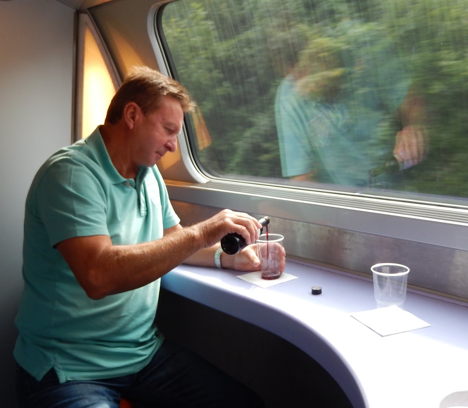 Putin înainte sa ajungem la destinatie, am trecut în vagonul restaurant - curiosi ce fel de vin se serveste. Un superb Bordeau, Merlot-Cabernet si singurul minus acordat ar fi pentru paharele din plastic care ne-au fost oferite. Fotografiile cu imagini distorsionate sunt facute în geamul trenului, la trecerea prin tunel.