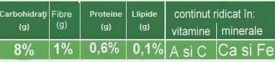 Fructul conține 89-90% apă și valoarea calorica este de 150kJ/100g (35kcal/ 100g).