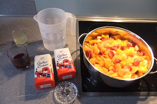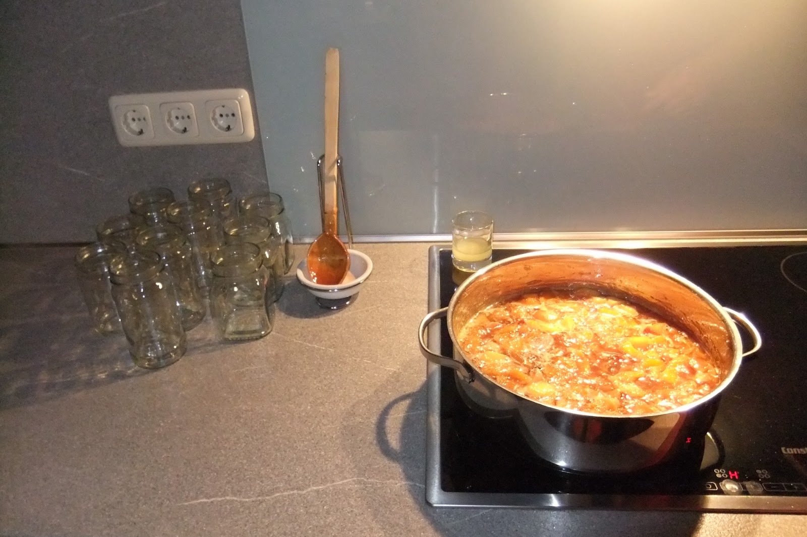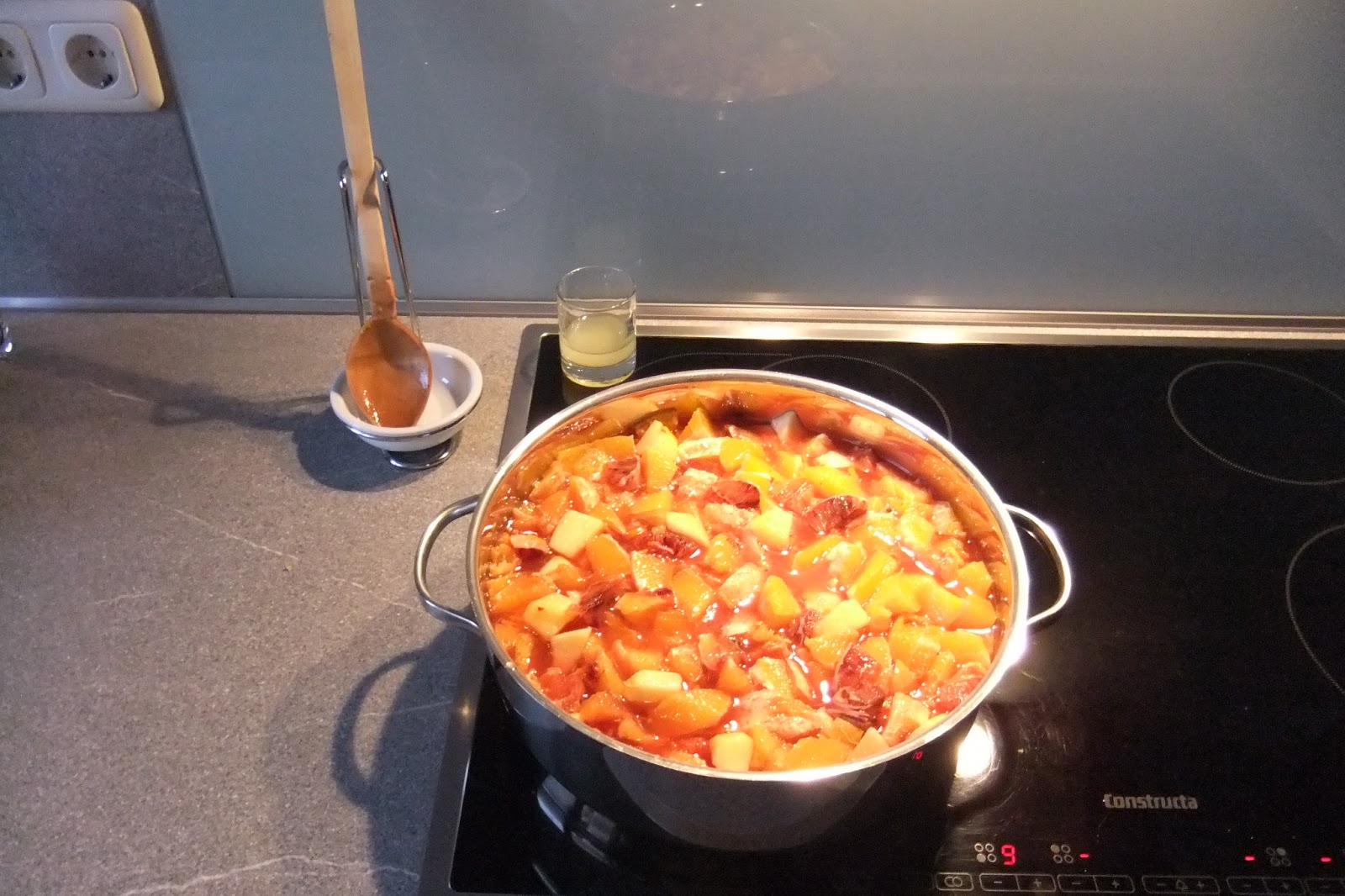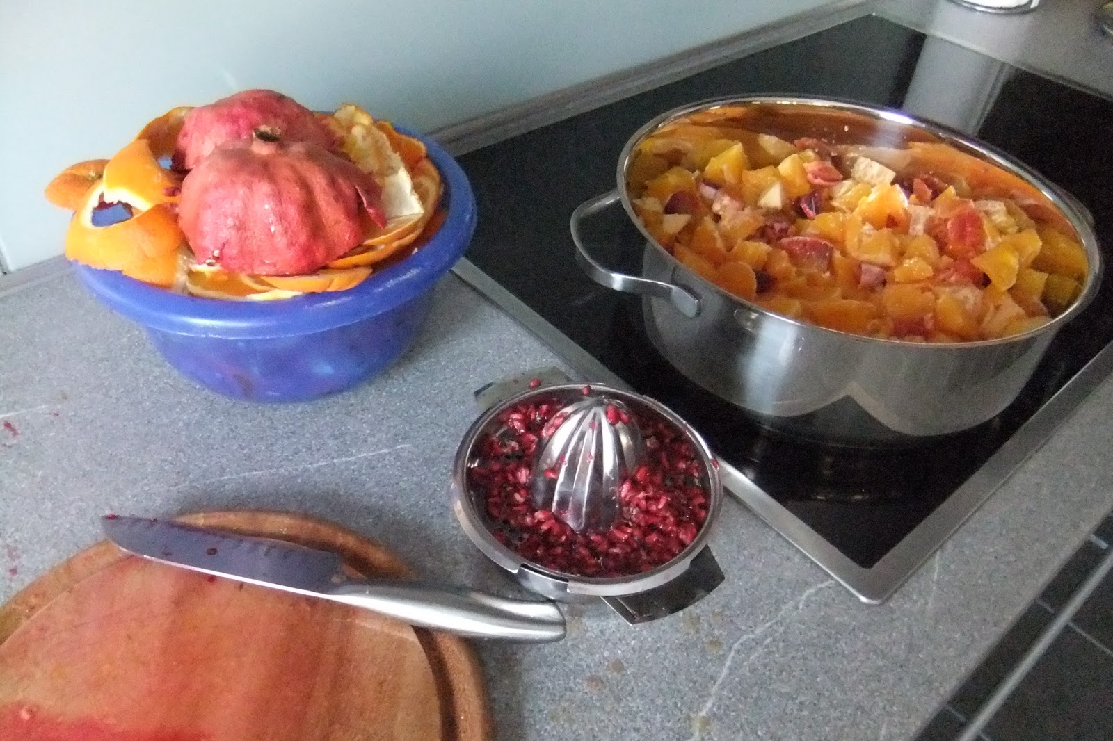Eu am improvizat putin, adaugând în plus sucul de la o rodie - care la fel, începuse sa se usuce, un mar descojit, un sfert de baton de vanilie si înainte de ultimul clocot, zeama de la o lamâie - pentru împrospatarea culorii.