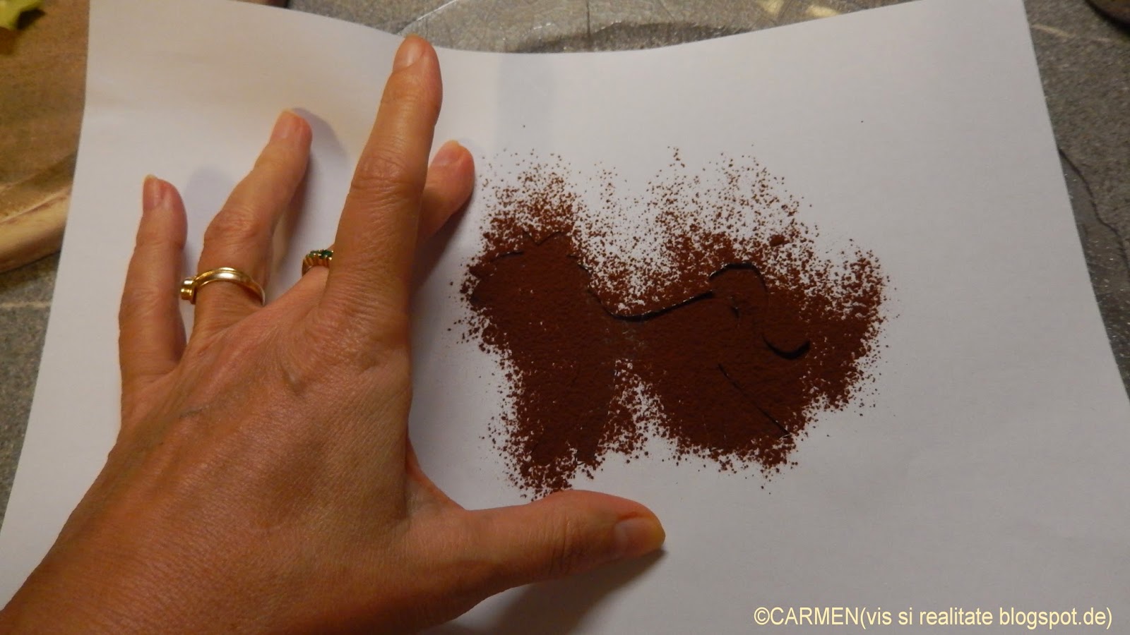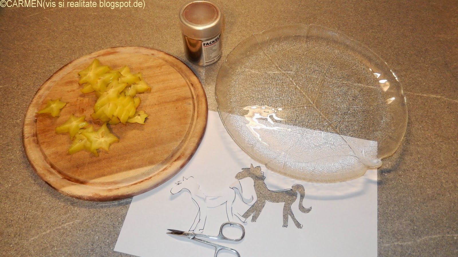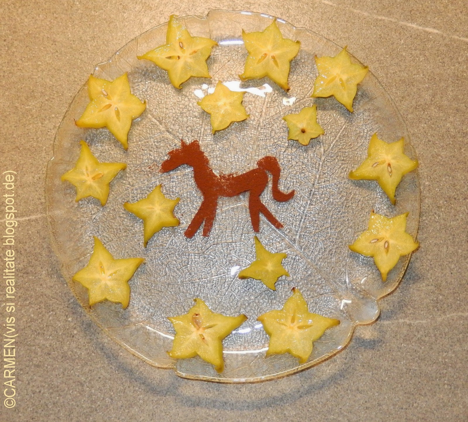 ....în farfurie! Asa ca, am taiat o carambola si ca sa fie mai șic, i-am asortat un cal maro (din praf de cacao)