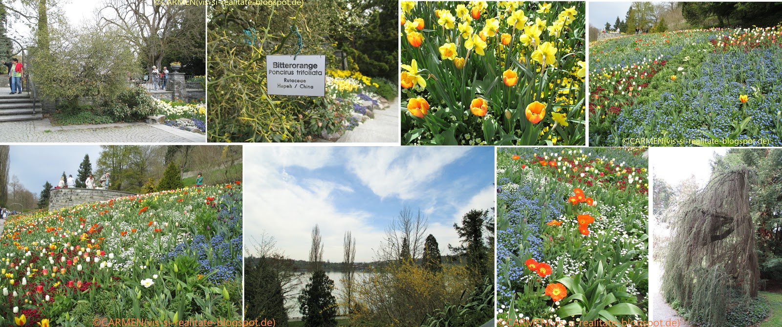 Insula Mainau îsi deschide portile primavara, la sfârșitul lunii martie cu traditionala expozitie de orhidee din Casa Palmierilor - o sera enorma care adaposteste si cofetaria palatului. Fotografiile cu orhidee le voi prezenta într-un articol separat, pentru ca merita! Asa cum de altfel merita fiecare gen de flori înflorite acum în aer liber - lalele, narcise, zambile si camelii. Aceste superbe "printese ale anotimpului" sunt expuse în rondouri încarcate cu panselute, nu-ma-uita, primule, maci, ranunculus, coroana-regelui si banutei. Covoarele multicolore de flori se întind între magnolii, ciresi, forsiții si kerria japonica. Imaginile sunt coplesitoare!