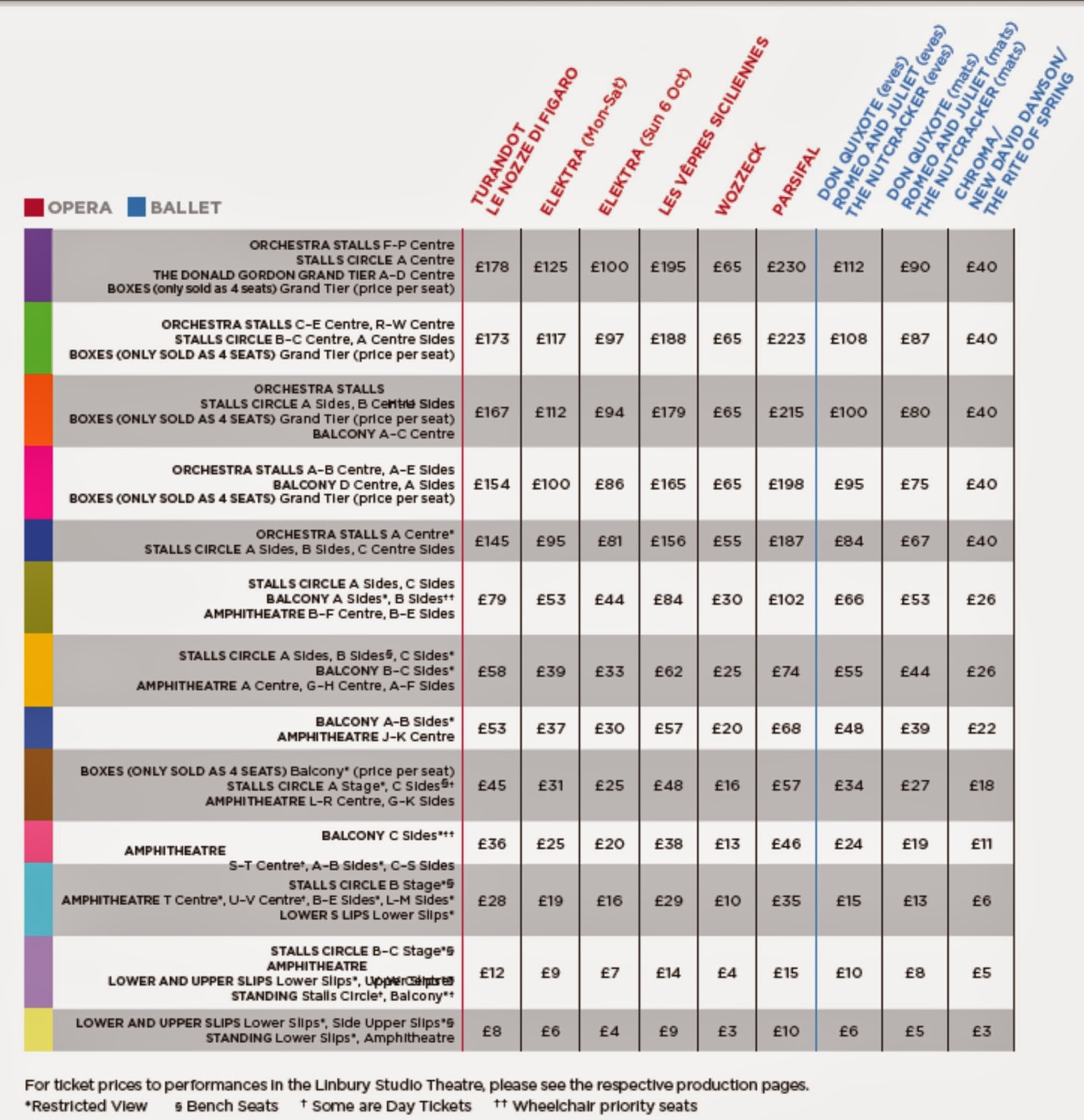 Mai sunt cazuri de exceptie când distributia este de vârf, iar preturile urca vertiginos. Cu toate ca un bilet poate ajunge la 800 de lire, un spectacol cu Domingo, Angela Gheorghiu, Alina Cojocaru se joaca mereu cu casa închisa. La un spectacol cu Angela Gheorghiu în opera Tosca un bilet a fost 250 lire, iar cel mai ieftin de 30 de lire. La acelasi spectacol cu o alta distributie, biletele pot fi de trei ori mai ieftine. Daca este o Gala Royala, unde vine Regina Elisabeta, biletele costa peste 2000-3000 de lire, dar chiar si în aceste conditii biletele sunt vândute în maxim o ora."