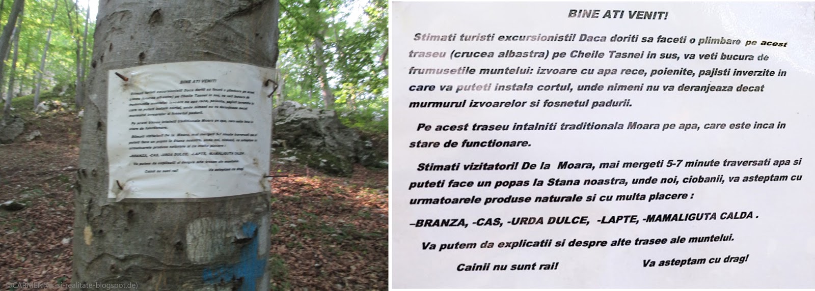 "Bine ati venit! Stimaţi turişti excursionişti, dacă doriti sa faceti o plimbare pe acest traseu (crucea albastra) pe Cheile Tâsnei în sus, va veti bucura de frumuseţile muntelui, izvoare cu apa rece, poienite, pajisti înverzite în care va puteti instala cortul, unde nimeni nu va deranjeaza decât murmurul izvoarelor si fosnetul padurii. Pe acest traseu întâlniti traditionala Moara pe apa, care este înca în stare de functíonare.Stimati vizitatori, de la Moara mai mergeti 5-7 minute, travesati apa si puteti face un popas la Stâna noastra, unde noi, ciobanii, va asteptam cu urmatoarele produse naturale si cu multa placere: brânză, caş, urdă dulce, lapte, mămăliguţă calda. Va putem da explicatii si despre alte trasee ale muntelui. Câinii nu sunt răi! Va asteptam cu drag!"