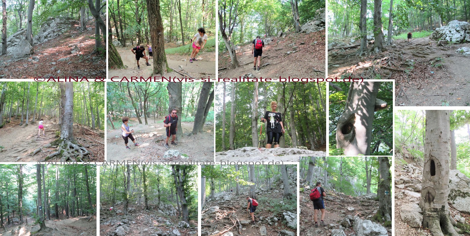 Prima jumatate de ora este doar urcuş, panta este abrupta iar stâncile rostogolite si macinate de vreme îngreuneaza înaintarea. Portiunile în care radacinile fagilor formeaza scari naturale sunt rare, noi le-am folosit pentru scurte pauze, sa ne tragem sufletul. Peisajul este fermecator si linistea profunda. Mereu observi ceva care te încânta: o iasca, o scorbura, câteva crengi rupte de vânt, un colos de calcar împresurat de licheni... Pe masura ce înaintezi, vârful copacilor devine tot mai luminos si frunzisul te apara tot mai putin de dogoarea soarelui. La iesirea din padure, descoperi o lume de basm... te gasesti pe stânci, undeva între cer si pamânt. Privelistea este grandioasa!
