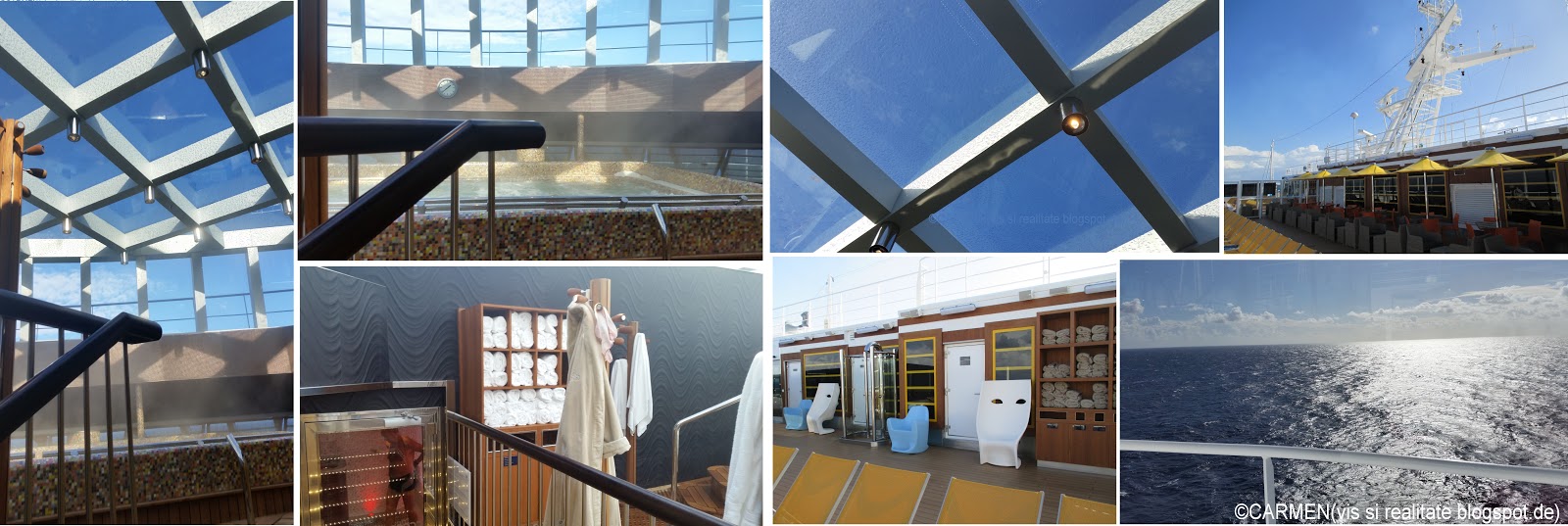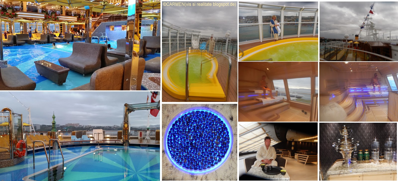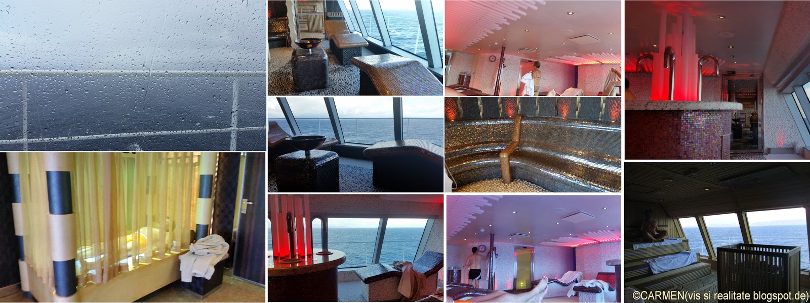 Complexul wellness era deschis de la opt dimineata pâna la ora zece seara, însa cum sa te împarti între toate minunatiile oferite de croaziera?! Este atât de greu sa alegi între zecile de atractii! Am încercat sa fim aici macar câte doua - trei ore pe zi. Masaje nu ne-am permis decât de doua ori însa si saunele sau salile tepidarium, bazinele jacuzzi, terasele sau salonul pentru servirea ceaiului, ne-au oferit zilnic clipe minunate de relaxare si confort.