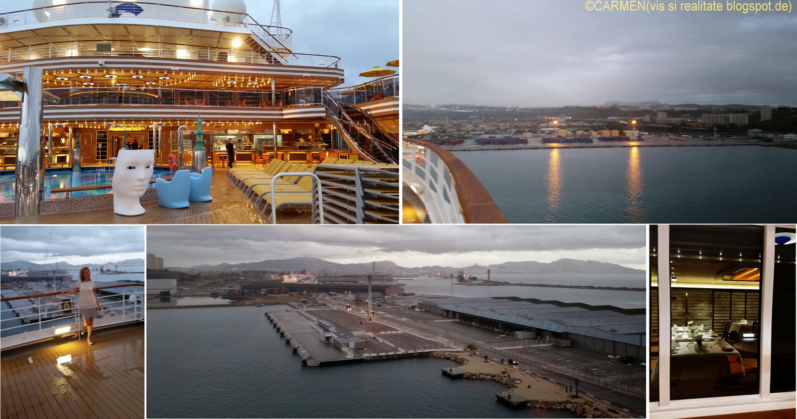Înainte de a merge în camera sa ne pregatim pentru dineu, am petrecut o jumatete de ora pe puntea cu piscina, admirând un apus de soare splendid! Portul Barcelonei a fost învaluit în aur!