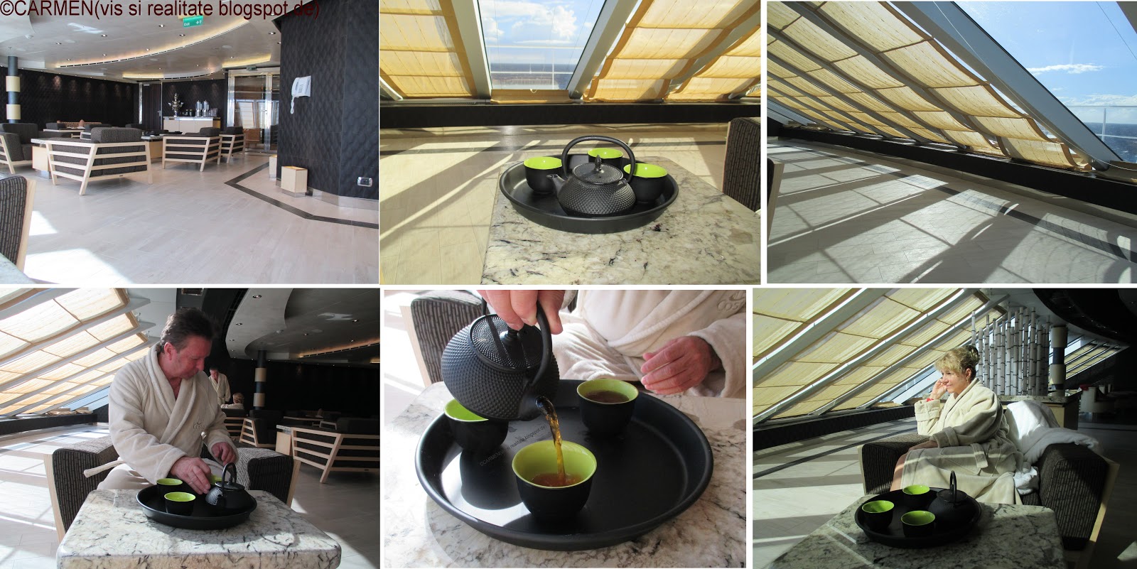 Dupa 20 de minute de jacuzzi, am intrat 20 de minute în sauna, la abur de cedru si portocala...o combinatie desavârsita! Destinsi, binedispusi, reechilibrati... Jocurile discrete de lumini si muzica de relaxare au avut un efect în plus de reenergizare asupra noastra. Am încheiat sedinta wellnes în salonul pentru ceai. Lânga samovarul de argint si vasele cu frunze de ceai verde, erau mereu aduse cesti curate. Este serviciu de lux - de care din pacate am prifitat mult prea putin. Acest serviciu este pus doar la dispozitia celor din Clubul Samsara - noi ne-am cumparat legitimatii în acest club însa, pentru câte ne-am propus noi sa facem pe durata croazierei, ar fi trebuit ca ziua sa aiba cel putin 30 de ore!☺. În comparatie cu piscinele si zonele de relaxare deschise pentru orice turist la bord, Clubul Samsara are capacitate limitata, tocmai pentru a asigura o anumita intimitate si comfort sporit. Intrarea aici se face pe baza unui cip cu curea pentru purtat pe brat, exact ca un ceas de mâna. Lânga fiecare din cele opt bazine, se gasesc rafturi cu prosoape la discretie. Exista perimetre în care prosoapele sunt albe ca neaua, altele ofera prosoape bej si altele albastre. Halatele bej, extrem de moi si pufoase, le-am primit la îmbarcare, împreuna cu cipul.
