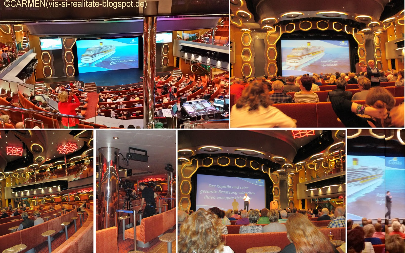 Întreg grupul de turisti vorbitori de limba germana a fost convocat în sala teatrului Emerald. Ne-au fost prezentate amanunte în legatura cu procedura de predare a bagajelor si checkout, atât verbal cât si vizual - printr-un film. Apoi pe scena au fost invitati reprezentanti ai personalului de pe vas, spre a ne lua la revedere de la bucatari, chelneri, stewarzi, animatori, dansatori, muzicanti, sefi sau lucratori simpli, care ne-au asigurat confortul si siguranta pe durata acestui concediu de vis.