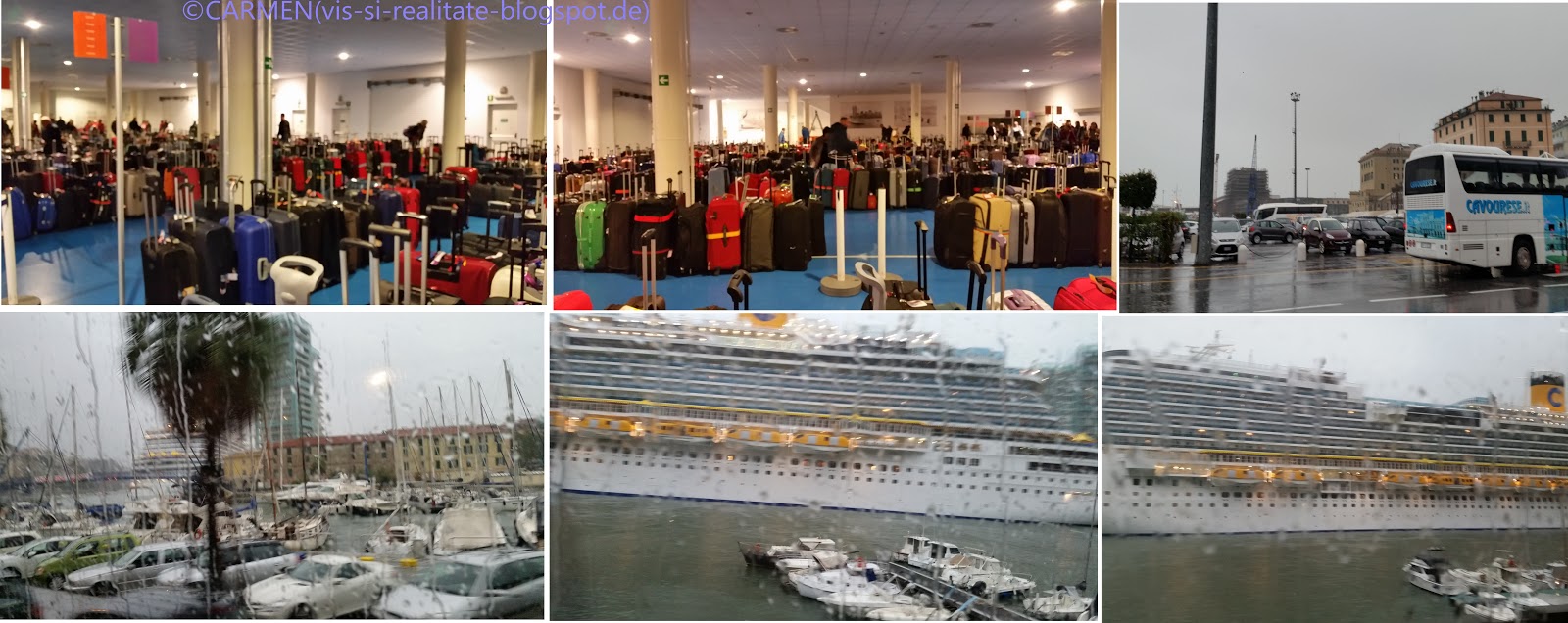 Tot la noroc ne-am gândit si când am vazut ca am primit bentite rosii pentru valize. Conform ultimului exemplar al Jurnalului de bord, pasagerii cu bentite rosii urmau sa paraseasca vasul la ora 8:30. Ne-am gândit ca pâna la ora 14 când urma sa porneasca autocarul nostru spre casa, avem timp sa vizitam portul Savona si centrul vechi al orasului, însa mai mult si mai mult m-am bucurat pentru ca urma sa o întâlnesc pe Geanina.Ne-am trezit odihniti si cu gândul sa nu uitam nimic în cabina nici nu am bagat în seama ploaia ce batea în geamuri. Am servit în tihna micul dejun si multumiti ca ne-am încadrat perfect în timp, ne-am prezentat la punctul de întâlnire - Grand Bar Orlov. Urma sa facem parte din primul grup ce cobora în port însa... organizatorii debarcarii au anuntat la microfon ca din cauza furtunii, vasul nu poate ancora. Cerul peste Savona era negru, marea foarte agitata si cu toate ca ne gaseam în port, vasul nu putea sa monteze puntea pentru debarcare. La fiecare sfert de ora ar fi trebuit sa coboare un grup, însa decalajul depasise deja limitele si la un moment dat, la punctele de întâlnire pentru debarcare se adunasera toti turistii - cu benzi rosii, verzi, galbele, albastre, portocalii, violete, bleu... La ora 10:45 au aparut si cei cu bentite roz. Cu toate acestea nu era haos, atmosfera pe vapor era destinsa. Cardurile all-inclusive functionau înca, asa ca lumea servea cafea, ceai sau soft drink si discutiile erau din ce în ce mai animate. La difuzoare se anunta din timp-în-timp mesajul ca pâna când vremea nu se va stabiliza, capitania portului interzice ancorarea vasului nostru. Comunicatul era citit în toate limbile pamântuli... parca eram pe Arca lui Noe.