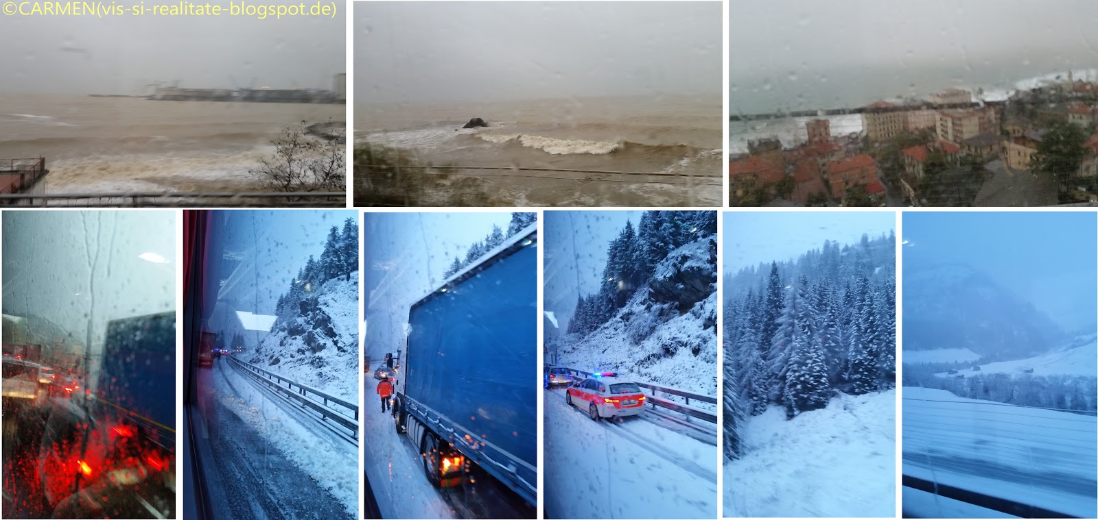 Pe masura ce ne-am apropiat de Alpi, cerul plumburiu si ploaia s-au transformat în ninsoare abundenta si sosele alunecoase, acoperite cu zapada, însa soferul nostru s-a dovedit experimentat si am depasit fara probleme toate situatiile dificile. În autocar a fost cald, însotitoarea de bord ne-a servit gustari si bauturi, totul a decurs în cele mai bune conditii. Călătoria noastra s-a încheiat odată cu lăsarea întunericului. În Germania era înca totul verde, toamna frumoasa era pe sfârsite.