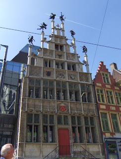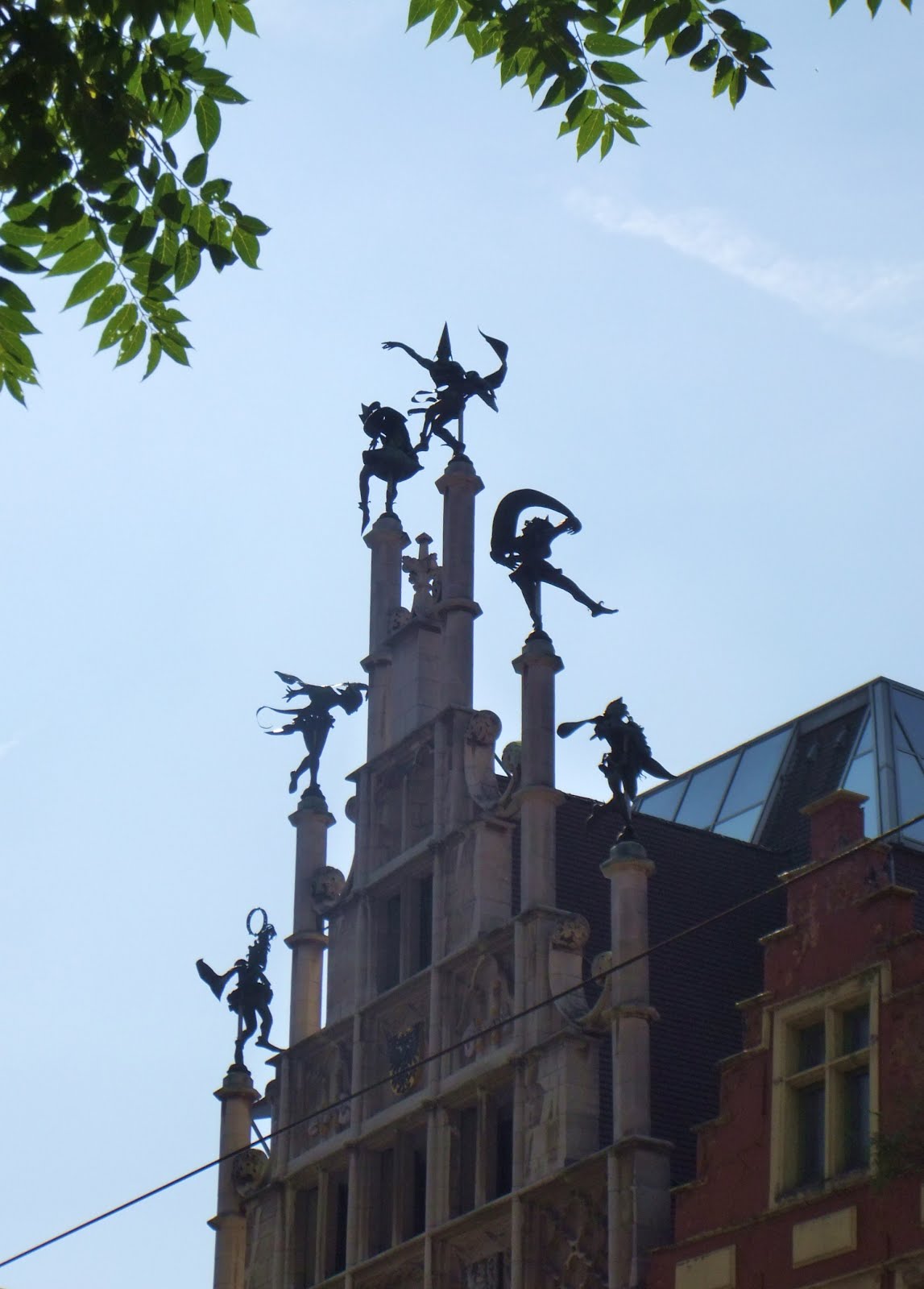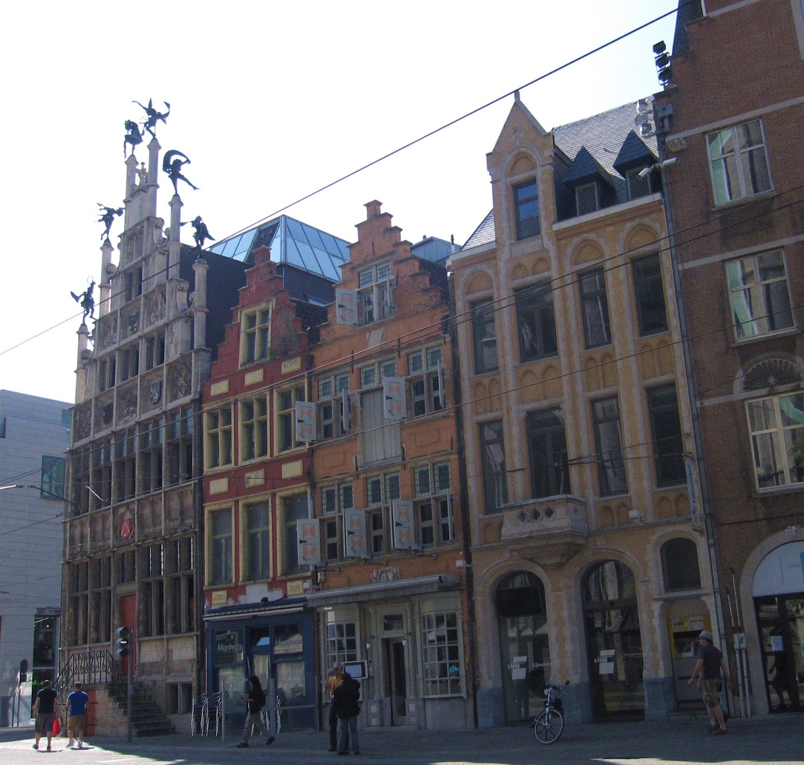 Fara a lasa spatii între ele si respectând diverse stiluri ahitecturale (baroc, gotic, brabant, renascentist-flamand, romanic), casele poarta fiecare un nume si are fiecare o poveste aparte. Pe mine m-a fascinat frontonul casei Metselaarshuis - datând secolul 16, decorat cu 6 dansatori ce se învârt în bataia vântului.