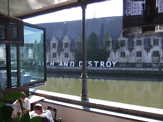 "Search And Destroy" - se numeste lucrarea expusa în spatele Halei Macelarilor, pe malul râului Leie, de catre Mekhitar Garabedian, un artist belgian nascut în Siria (1977, Alep). Am descoperit expozitia întâmplator, admirând privelistea oferita de terasa restaurantului de pe chei. Realizarea m-a impresionat însa nu am înteles ce reprezinta.