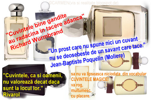 În seria Povesti parfumate, din cadrul Clubului initiat de Mirela, am pregatit pentru tema de astazi doua colaje cu parfumuri si citate celebre, despre arta rostirii cuvintelor. Fie ca aroma acestor parfumuri sa ne însoteasca fiecare zi!